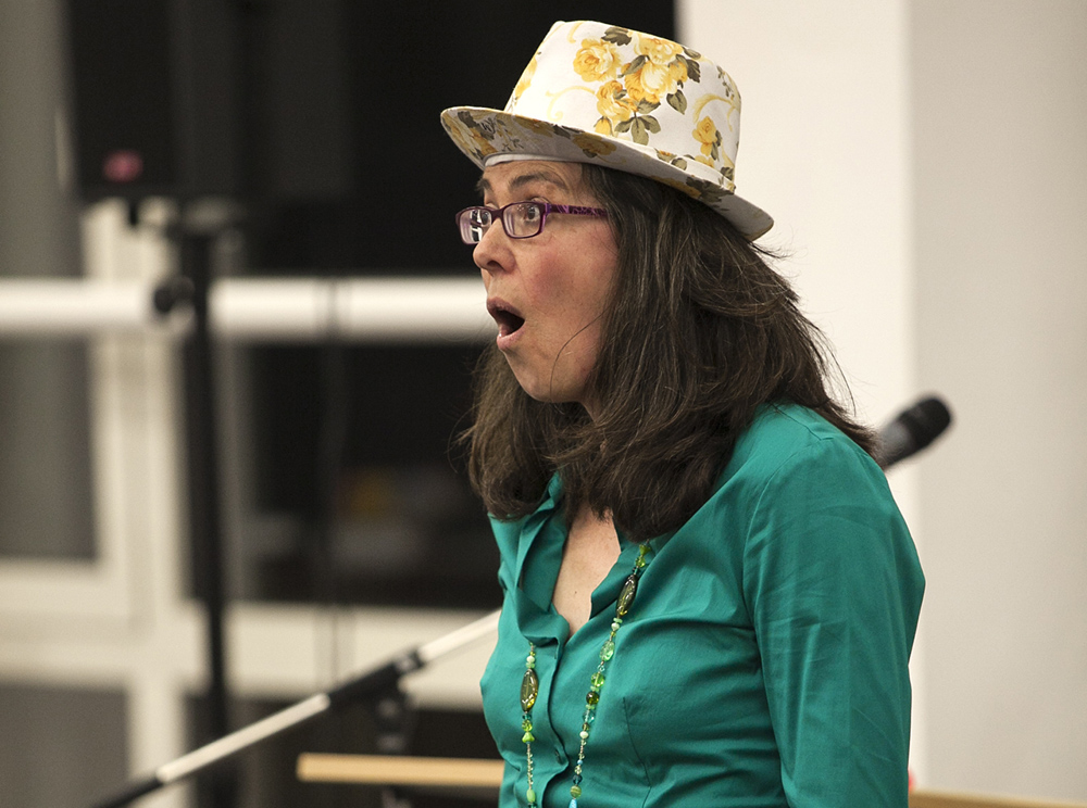 Pfarrerin Gisela Matthiae als Clownin bei einem Auftritt in der Evangelischen Akademie am Römerberg. Über das Verhältnis von Glauben und Humor hat sie gerade ein Buch geschrieben, außerdem bietet sie „Clownworkshops“ an. Seit April leitet sie zusammen mit ihrer Kollegin Anne Daur-Lyrhammer das Evangelische Frauenbegegnungszentrum in Frankfurt. Foto: Ilona Surrey