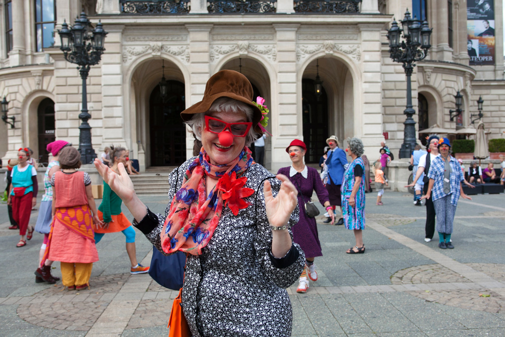 Clownalarm: Rote Nasen auf dem Opernplatz