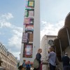 Am Turm der Weißfrauen Diakoniekirche hängen seit gestern Flaggen aus verschiedenen Ländern mit „Bettelkartons“ darauf.